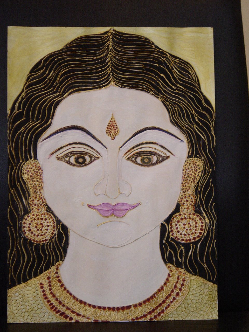 I wasn’t entirely happy with this picture. I meant to depict Sri Bala as a beautiful , smiling child. I felt upon completion that her expression in this image was rather stern. In particular, the eyebrows are arched in a manner as if to say “ I am here to punish wrong doers”. Hence, I did not intend to put this picture on my website. Bala resisted my plan and instead of choosing some of my later ( and a bit more improved) pictures, chose this one of herself to be the first in this set of thirteen holy images.