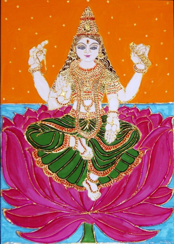 This drawing is the customary depiction of Sri Bala seated on a lotus with four hands , holding a book and sacred beads in two of her hands; the boon- giving and fear- dispelling gestures in the other two hands, respectively. It was Sri Bala’s desire to be portrayed in this style because she appears to her devotees here as the supreme Child Goddess who is taking complete charge of their lives. Both the advancement in material pursuits as well as spiritual pursuits are symbolized by this icon.