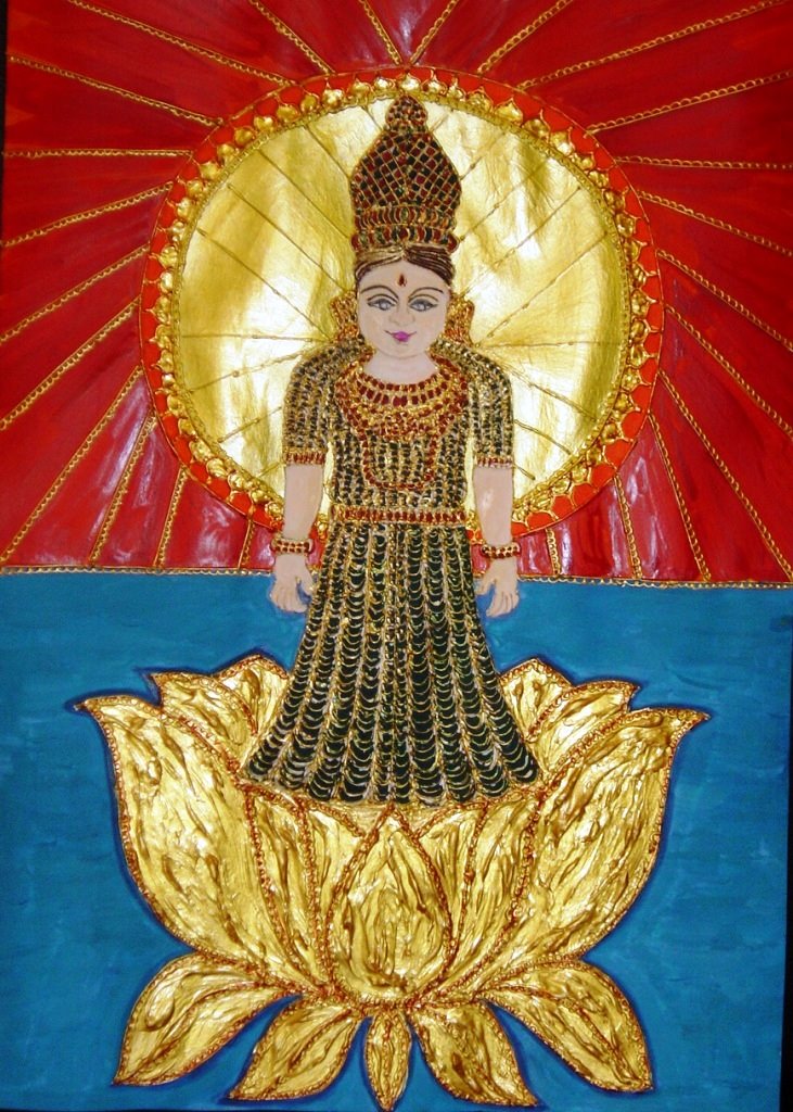 It was Sri Bala’s specific request that I should paint her in this posture, standing on a shining, golden lotus. The moment I finished this painting and stepped back to view it, Sri Bala seemed to come to life and gave me a fleeting, mischievous smile! This is one of my favourite paintings in the set of 13 images I have completed!