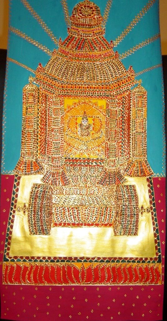 It was Sri Bala’s wish that I should draw her as a tiny figure, seated on this huge, decorated chariot. As I was embellishing the chariot, the thought occurred to me that when this drawing was finished, Bala’s face would be hardly visible. Contrary to my expectations, Bala’s small, moon-like face radiates with a rare clarity in this painting.