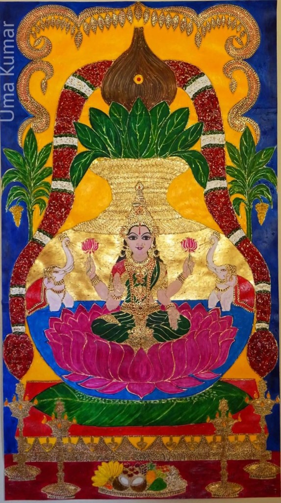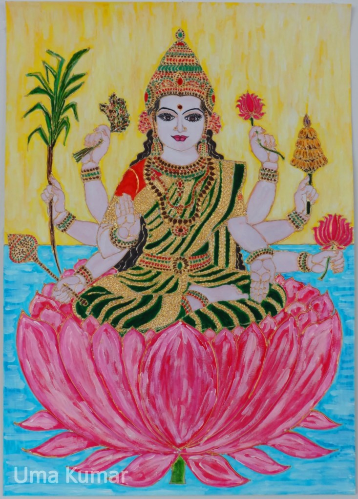 The Lakshmis Click to view larger images. Sri Vara Mahalakshmi Gaja Lakshmi – by Uma Kumar Dhana Lakshmi Dhaanya Lakshmi – by Uma Kumar Share this: Click to share on X (Opens in new window) X Click to share on Facebook (Opens in new window) Facebook Like Loading... Related