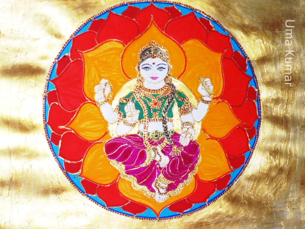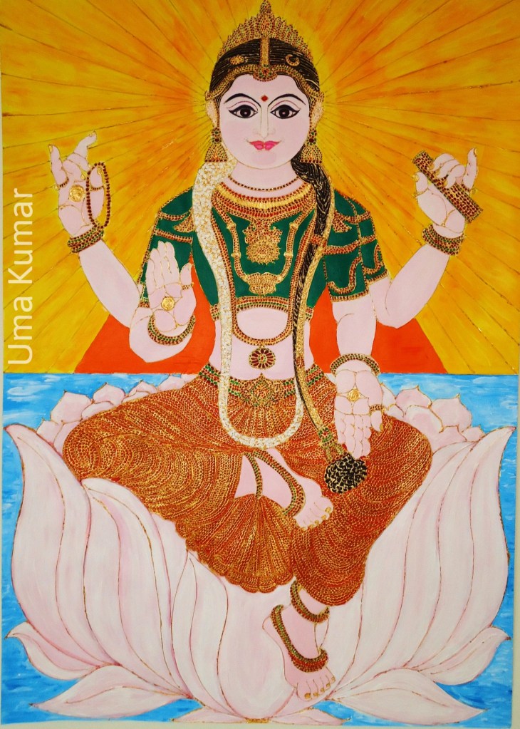O glowing brightly, glowing light, You were born out of light As radiant, glowing light, you pervaded everywhere, You are our protecting Goddess of light! You are Shiva’s energy, Vishnu’s power and that of Brahma too! We shall pray to you day by day Please protect and grace us, our dear mother.