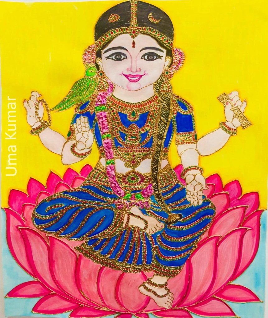 Oh emerald hued Goddess, the guiding light in our lives, you are the inspiration and the source for all beautiful poetry and arts! You provide energy to the planet god Mercury or Budhan, so he can confer on us the wealth of knowledge, education as well as harmonious relationships! Oh, source of all Music, you are the essence of all Vedas (scriptures). You are the origin of all the arts, melody and dance! Oh goddess, from you springs the knowledge that leads to pure minds, good thoughts and liberation. You give us encouragement to accomplish our goals in this life. You are that ocean of mercy into which we all long to merge! You are our ultimate protection. Glowing saffron red in color, you hold a book and a string of rosary beads in your hands. You are the creator of the planet god Budhan , you are the ruler of the houses, Gemini and Virgo. Oh, Divine child, you are untouched and far beyond good merits and sins. You are adored and worshipped by those well versed in the Vedas. Bala, may we have your grace and derive support and protection during the transitory effects of the nine planets. ( Om Bala Jaya Om Balambikkaiye).